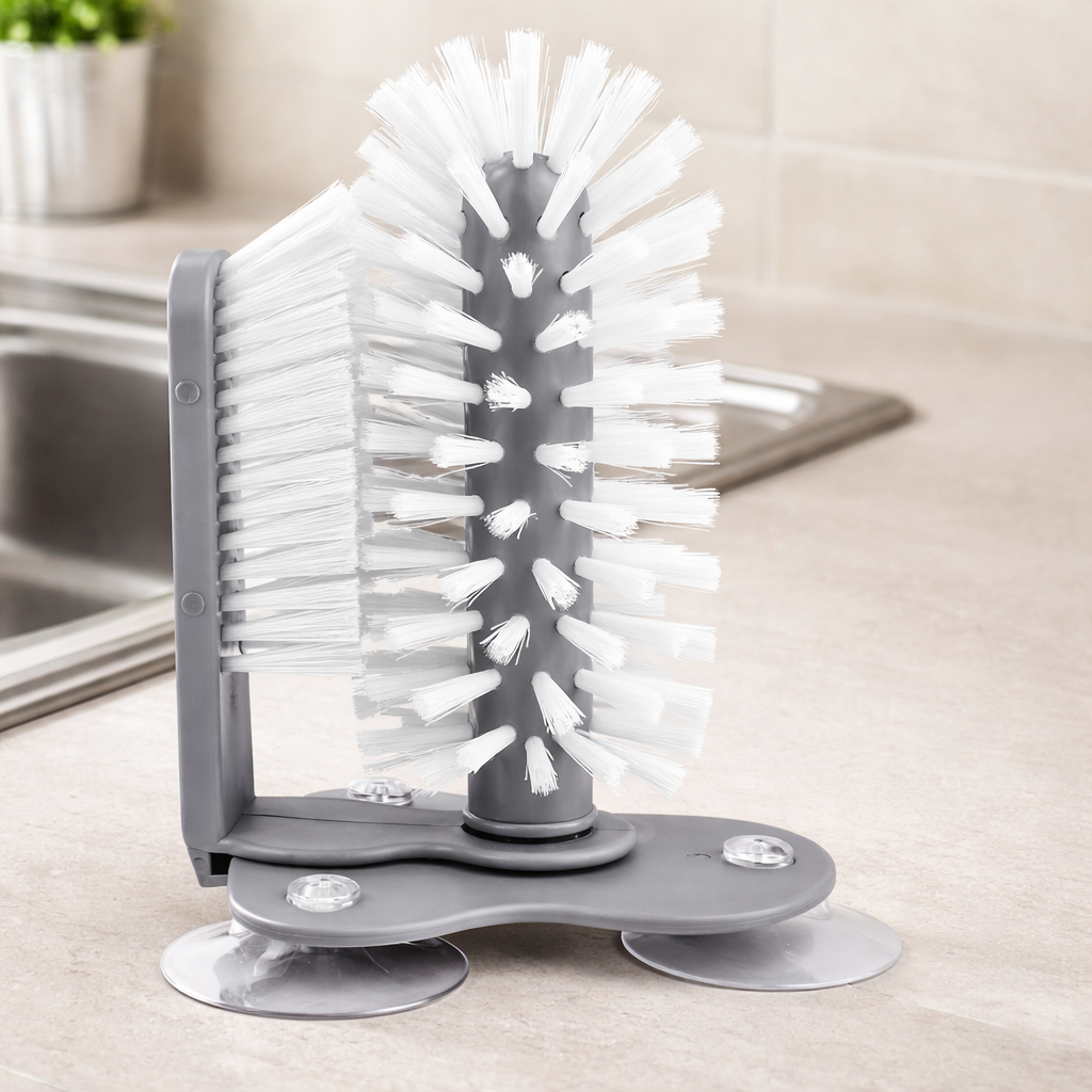 Este cepillo para cristalería de doble cara está diseñado para limpiar simultáneamente el interior y exterior, permitiéndote eliminar residuos de forma rápida, práctica y eficiente directamente en el fregadero.